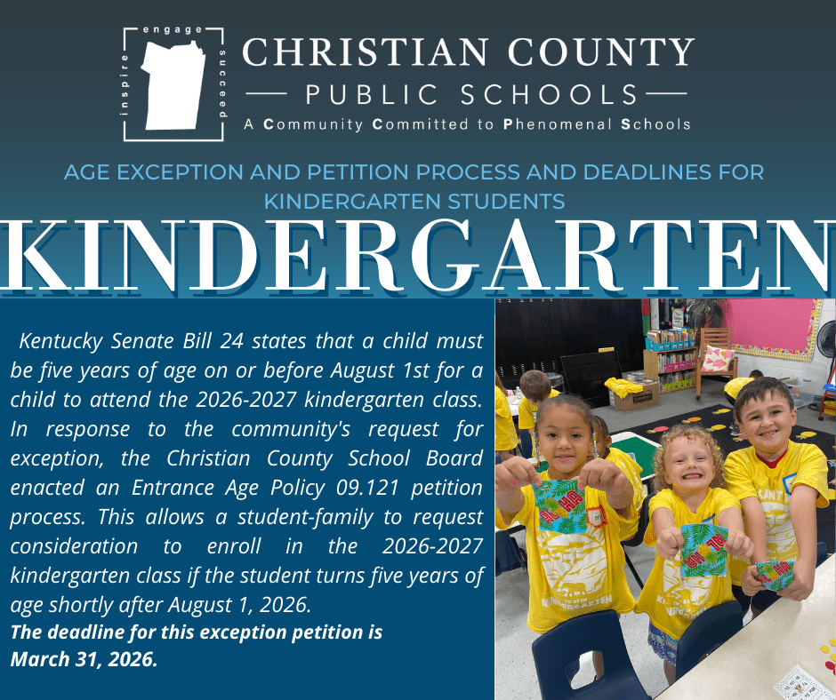 In Kentucky, children entering kindergarten must five years old before August 1, but the Christian County Public School System allows parents to submit petitions for their children to start elementary school if they are still four years old.