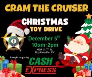 To help provide gifts to those who are less fortunate, the Christian County Sheriff’s Office is partnering with Cash Express for their annual Cram the Cruiser Toy Drive on Friday.