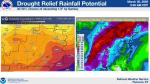 Tuesday will stay mostly dry, so says Meteorologist Kate Hickford with the National Weather Service in Paducah, but then Tuesday night brings the first of our rain chances. Those rain possibilities will stick around, with the best chances set for Thursday and into Saturday—though Hickford was disappointed to say our rain totals have been trending downward.
