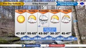 While the start of the week will have fairly mild temperatures, a cold front bringing rain Tuesday night into Wednesday will cool things right back down. Lead Forecaster Keith Cooley with the National Weather Service in Paducah says that’s when our first chance for some snow fall will occur—but it’s not looking all that impressive.