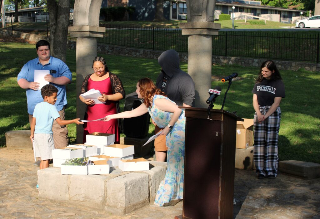 To further celebrate the journal’s anniversary, Riley invited audience members to share any memories they have associated with the journal and HCC’s Round Table Literary Park. Professor Pat Riley has worked at HCC for nearly 28 years, and before applying for the job, he received a brochure that included the park, and says is it was one of the factors that attracted him to the college. After getting the job, Riley says he lived across the street from HCC and would always pass through the park.