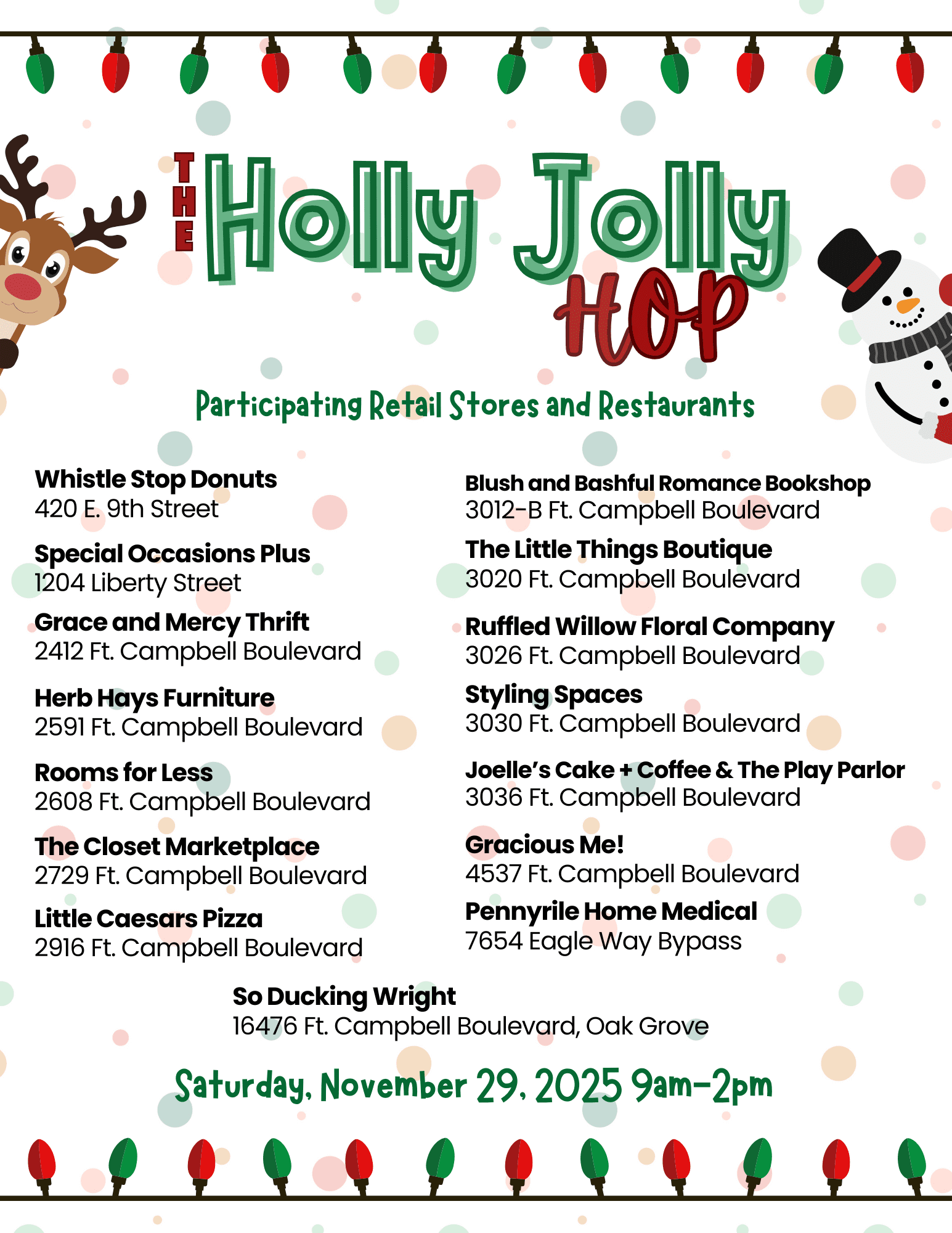 The Holly Jolly Hop Community Shop is a collaboration among the Christian County Chamber of Commerce, Downtown Renaissance District and the Hopkinsville Small Business Commission.