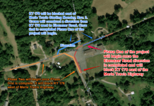 When phase one wraps up, phase two will begin with KY 176 west of Merle Travis Highway closing to through traffic. Vehicles will be rerouted onto the new section of KY 176 that connects to Ebenezer Road, and the temporary diversion will be removed.