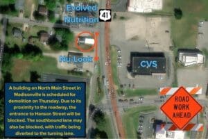 The Kentucky Transportation Cabinet announced that the structure being removed is near the 17-mile point of U.S. 41 between Evolved Nutrition and Nu-Look Cleaners. Near the demolition, south-bound lane traffic will be moved to the center lane and the first entrance to Hanson Street will be closed.