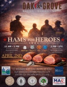 Ham for Heroes will take over the Equestrian Center Parking Lot at Oak Grove Racing, Gaming and Hotel starting from 11 a.m. From 11 a.m. to 1 p.m., active duty service members can pick up a free holiday ham, then after 1 p.m., the event opens to veterans.