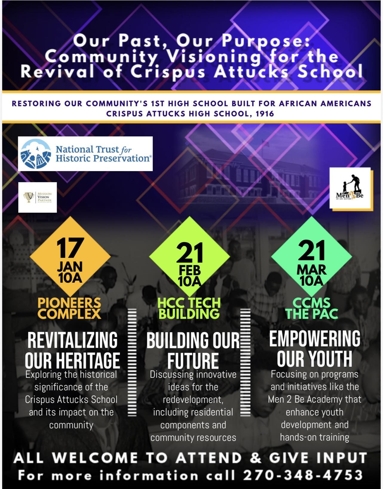 Men 2 Be is working to revitalize Crispus Attucks High School and transform it into a community center, and to share their vision for the school, the nonprofit is hosting a series of public forums.