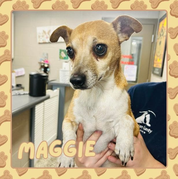 Maggie is an 8-year-old Chihuahua mix who is a little nervous but ready to go to a home of her very own! She gets along with other dogs, does well with cats and would do great with children over the age of 12 who understand that dogs need a little space. She’s also house-trained and crate-trained, so she’s ready to go home today!