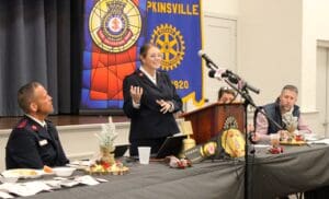 Salvation Army Lieutenants Brittney and David Donegan shared their mission and sparked some friendly competition between civic organizations at Tuesday’s joint Hopkinsville Rotary and Kiwanis Club meeting.