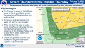 Our very mild temperatures will continue, with Lead Forecaster Keith Cooley with the National Weather Service in Paducah saying temperatures will linger in the upper 60’s and lower 70’s during the day, and then not cool off too much in the overnight hours. Those temperatures will stay pleasant until a cold front sweeps through Thursday night, bringing with it a chance of severe storms that could bring the risk for damaging winds and tornadoes.