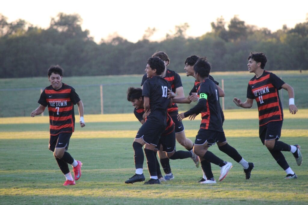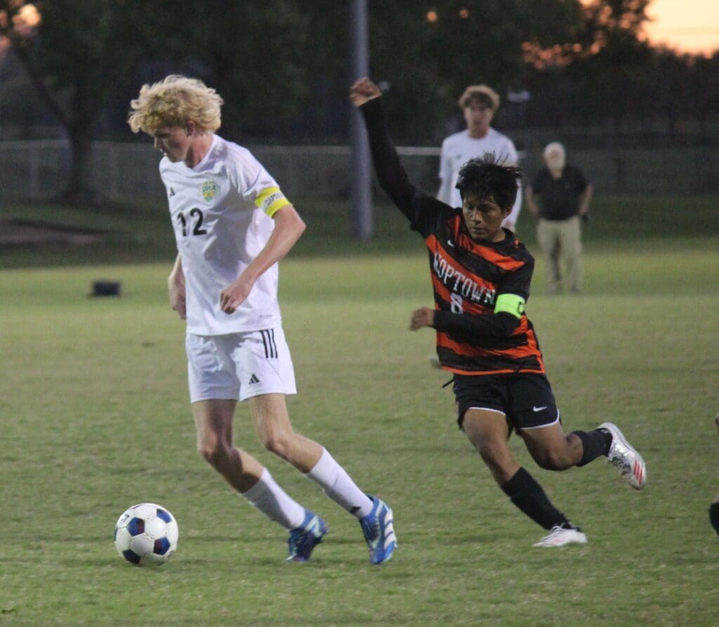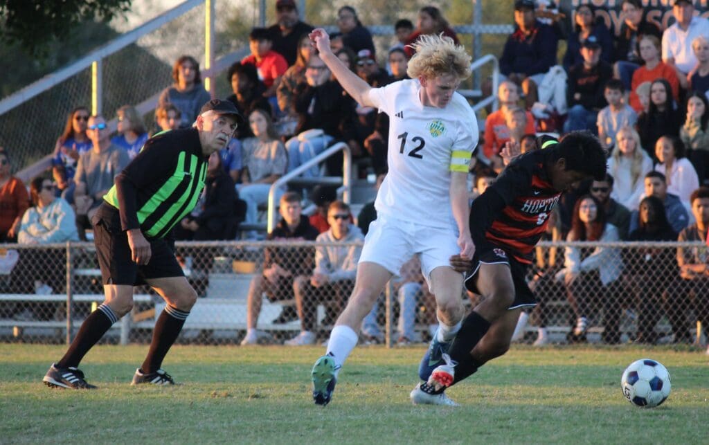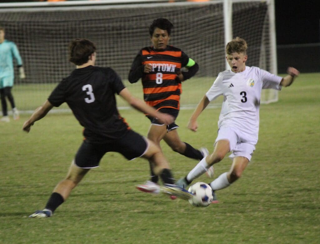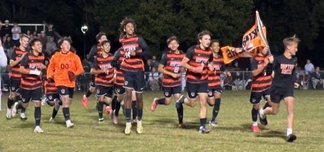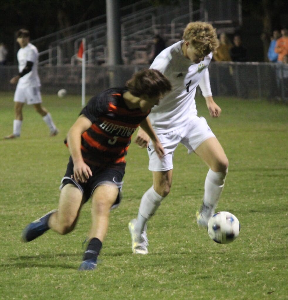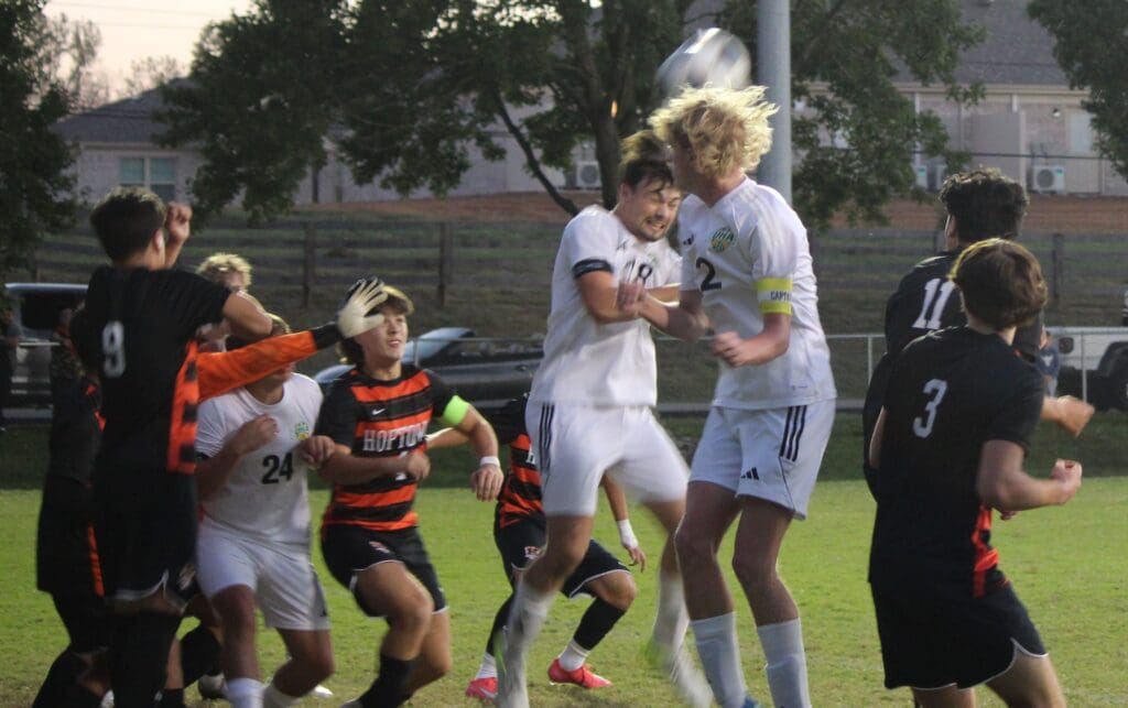 The Blazers tied the game 1-1 with 36:35 to go in the game when keeper Hayden Fitzsimmons sent a long pass over the defense. Hayden Hunt sent a lazer toward Hoptown goalie Raul Rivera who knocked down the pass. In the scrum around the loose ball, Rivera tried to clear it out but the ball bounced off a Tiger player’s leg and into the goal.